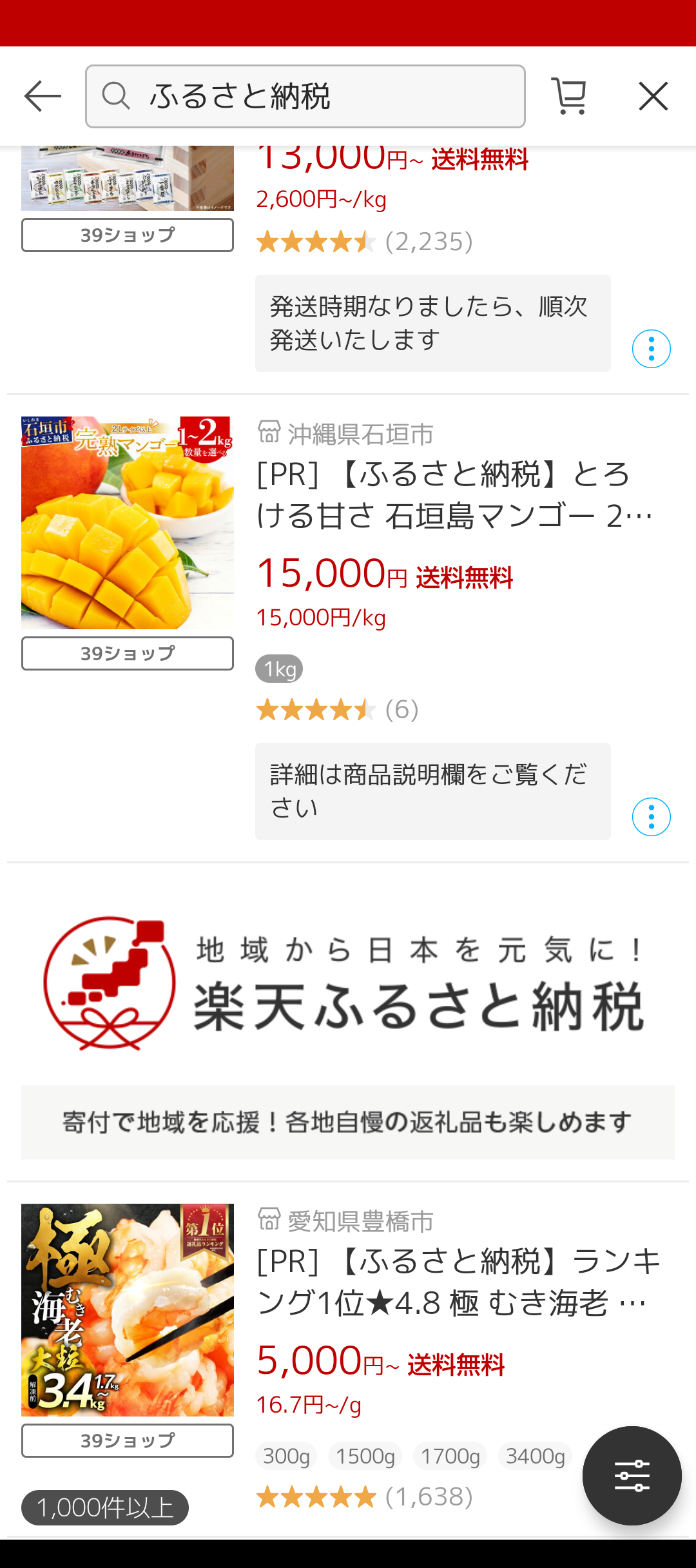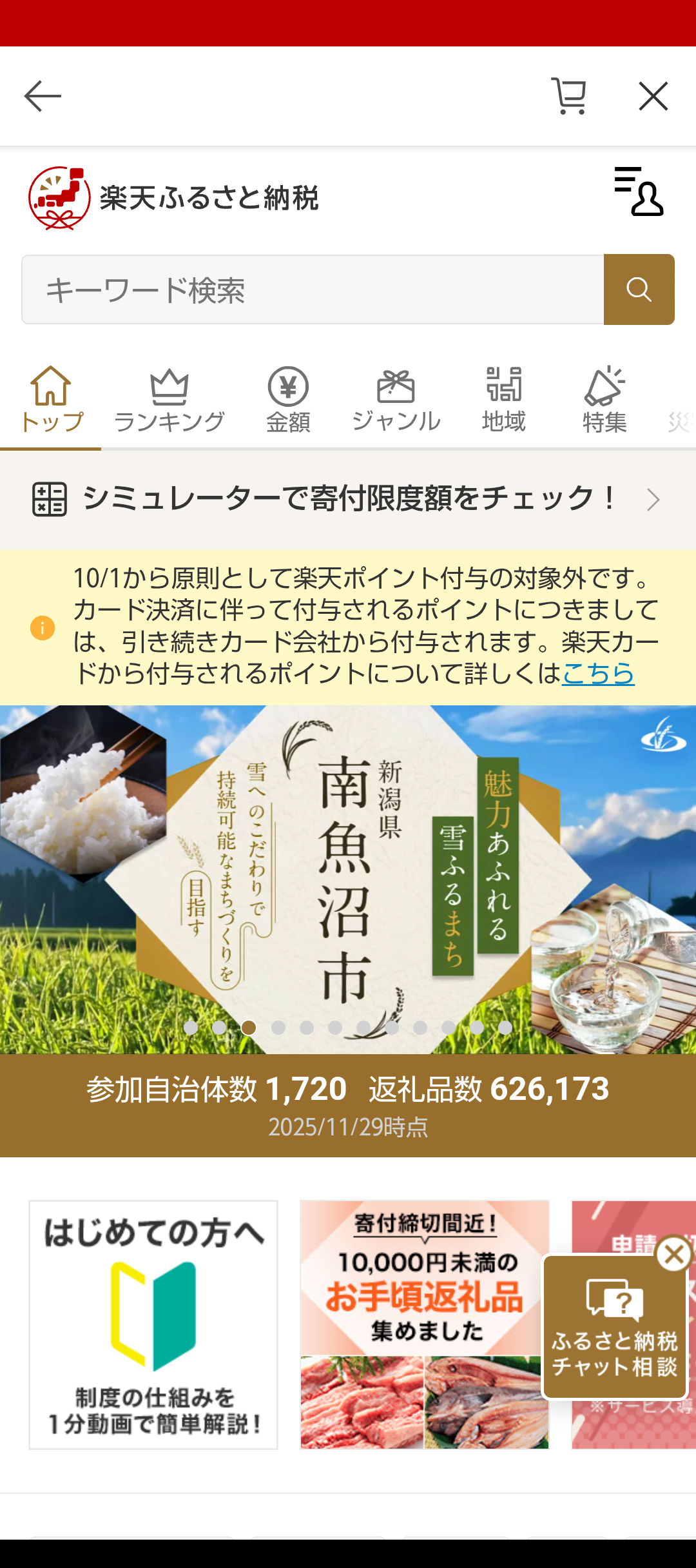 トップ画面に表示される「楽天ふるさと納税」のバナーをタップすれば、専用ページにアクセスできます。